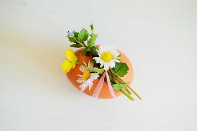 Potreban materijal: obična jaja, svježe ubrano cvijeće i ukrasne vrpce po mogućnosti od tkanine.