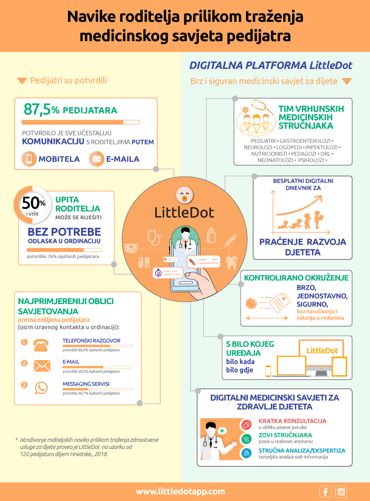 U kraćem istraživanju koje je LittleDot proveo među pedijatrima diljem Hrvatske, 87,5 posto ispitanih pedijatara istaknulo je sve češću komunikaciju s roditeljima putem mobitela i e-maila. Također, gotovo 80% pedijatara smatra da je polovinu i više upita o zdravlju djece moguće riješiti bez odlaska u ordinaciju, preko telefona ili e-maila, čime se dodatno pridonosi zaštiti djetetova zdravlja u situacijama kad za posjet liječniku ne postoji medicinski opravdan razlog. Kao najprimjereniji beskontaktni oblik savjetovanja, kad je riječ o zdravlju djece, ispitani pedijatri ističu telefonski razgovor, nakon čega slijedi e-mail te potom messaging servisi.