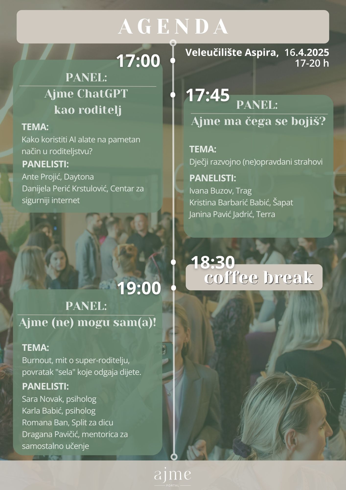 Ajme portal 16. travnja 2026. od 17 do 20 sati na Veleučilištu Aspira u Splitu pod pokroviteljstvom Baby Centra organizira svoju treću roditeljsku konferenciju “Ajme, ja sam roditelj!”.